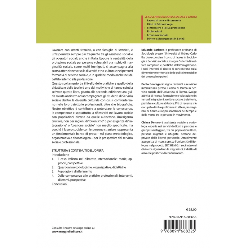 Lavorare con utenti stranieri, o con famiglie di stranieri, è un'esperienza sempre più frequente tra gli assistenti sociali e gli operatori sociali, anche in Italia. Eppure la centralità della protezione sociale per persone vulnerabili o a rischio di marginalità sociale, come molti immigrati, si accompagna alla scarsa attenzione verso la diversità etno-culturale nei percorsi formativi di servizio sociale, e in qualche modo anche nel dibattito interno alla professione. Questo scollamento tra il livello delle pratiche e quello della didattica e delle teorie è uno dei motivi che ci hanno spinti a scrivere questo libro, giunto alla seconda edizione: una guida mirata anzitutto ad accompagnare gli studenti di Servizio sociale dentro la diversità culturale con cui si confronteranno nelle loro traiettorie professionali, oltre che biografiche. Nostro obiettivo è contribuire a potenziare le conoscenze, le competenze e soprattutto la riflessività nel lavoro sociale con popolazioni diverse da quelle autoctone. Un'esigenza cruciale, non per ragioni di “buonismo” o per esigenze di “integrazione” o “coesione sociale” non meglio specificate, ma perché il lavoro sociale con le persone straniere rappresenta un fondamentale banco di prova – sul piano metodologico, organizzativo e deontologico – per le prospettive del servizio sociale professionale.