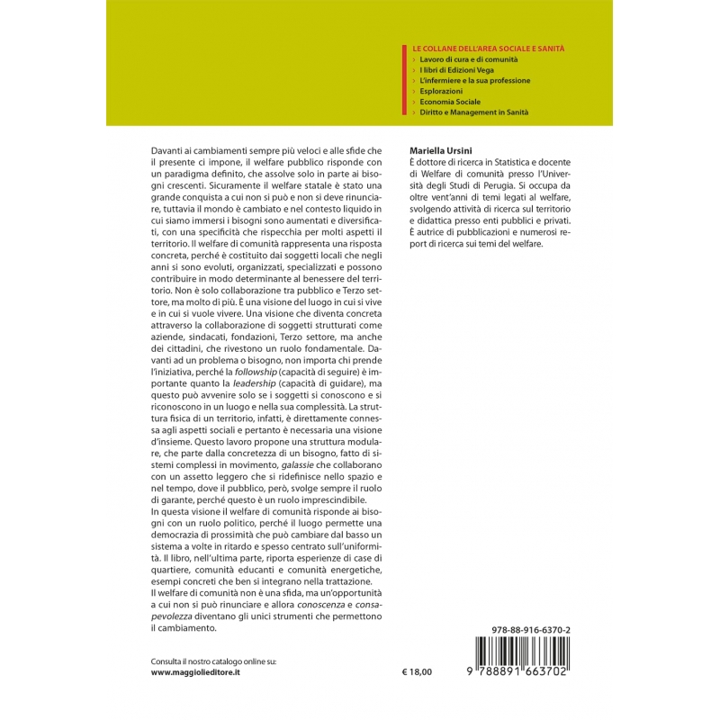 Davanti ai cambiamenti sempre più veloci e alle sfide che il presente ci impone, il welfare pubblico risponde con un paradigma definito, che assolve solo in parte ai bisogni crescenti. Sicuramente il welfare statale è stato una grande conquista a cui non si può e non si deve rinunciare, tuttavia il mondo è cambiato e nel contesto liquido in cui siamo immersi i bisogni sono aumentati e diversificati, con una specificità che rispecchia per molti aspetti il territorio. Il welfare di comunità rappresenta una risposta concreta, perché è costituito dai soggetti locali che negli anni si sono evoluti, organizzati, specializzati e possono contribuire in modo determinante al benessere del territorio. Non è solo collaborazione tra pubblico e Terzo settore, ma molto di più. È una visione del luogo in cui si vive e in cui si vuole vivere. Una visione che diventa concreta attraverso la collaborazione di soggetti strutturati come aziende, sindacati, fondazioni, Terzo settore, ma anche dei cittadini, che rivestono un ruolo fondamentale. Davanti ad un problema o bisogno, non importa chi prende l’iniziativa, perché la followship (capacità di seguire) è importante quanto la leadership (capacità di guidare), ma questo può avvenire solo se i soggetti si conoscono e si riconoscono in un luogo e nella sua complessità. La struttura fisica di un territorio, infatti, è direttamente connessa agli aspetti sociali e pertanto è necessaria una visione d’insieme. Questo lavoro propone una struttura modulare, che parte dalla concretezza di un bisogno, fatto di sistemi complessi in movimento, galassie che collaborano con un assetto leggero che si ridefinisce nello spazio e nel tempo, dove il pubblico, però, svolge sempre il ruolo di garante, perché questo è un ruolo imprescindibile.